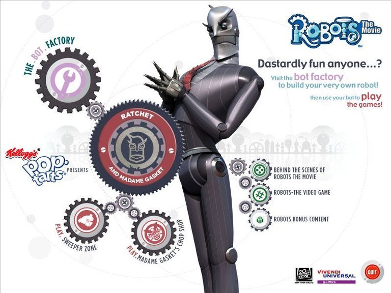 Kellogg’s Pop-Tarts Presents Ratchet & Madame Gasket’s Sweeper Zone is a 2005 promotional game featuring two mini-games and a robot customization activity, bundled with Pop-Tarts to promote the movie Robots.