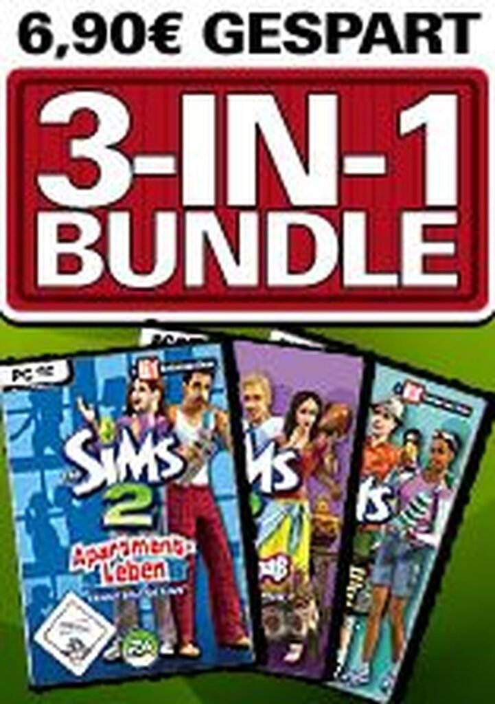 A compilation of three *Sims 2* expansions—*Apartment Life*, *Bon Voyage*, and *FreeTime*—adding urban living, travel, and hobbies to the life simulation.