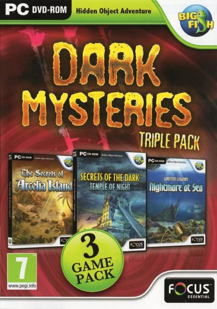Dark Mysteries Triple Pack bundles three hidden object games—Arcelia Island, Temple of Night, and Nightmare at Sea—into a single atmospheric puzzle-solving experience set in enigmatic locales.