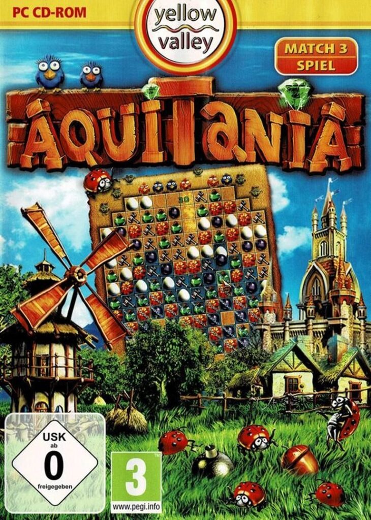 Aquitania is a match-three puzzle game where players swap tiles to create matches, clear blue squares, and manage a constant stream of new tiles dropped by birds. It features unique obstacles, power-ups, and is based on the ancient Roman province of Gallia Aquitania.