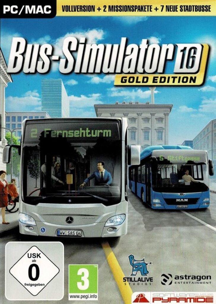 Drive authentic buses and manage routes in Bus Simulator 16: Gold Edition, a complete simulation package featuring MAN and Mercedes-Benz vehicles across a dynamic urban environment.