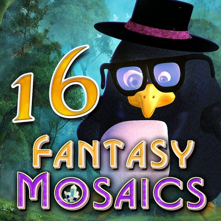 Penguin family explores multi-color Wonderland in Fantasy Mosaics 16, tackling six-color mosaic puzzles to reveal images and build stunning landscapes.