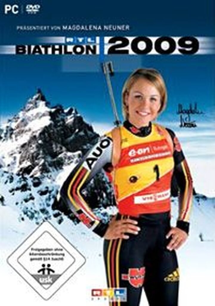 RTL Biathlon 2009 simulates biathlon skiing and shooting with stamina management, precise aiming, and new super-powers across licensed courses.