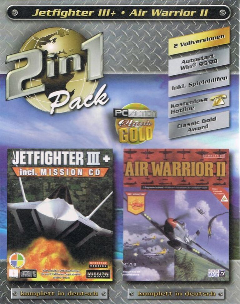 A 1999 compilation featuring Jetfighter III+’s modern aerial combat and Air Warrior II’s WWII multiplayer dogfighting, offering two distinct flight simulator experiences in one package.