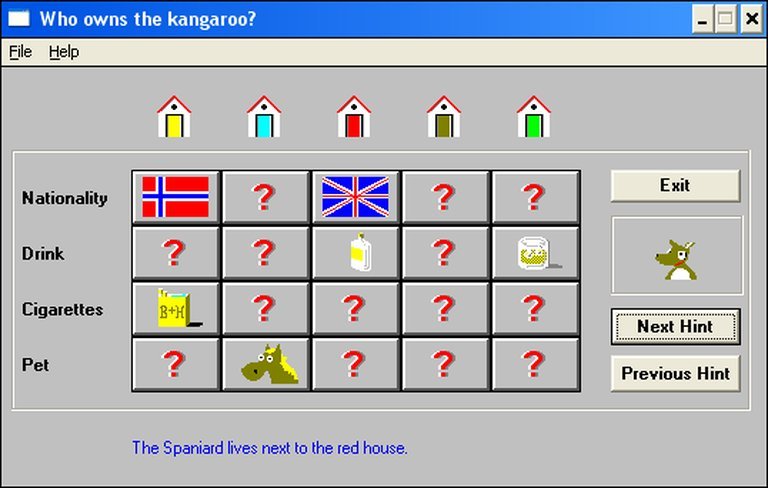 Who Owns the Kangaroo? is a 1999 puzzle game where players deduce which house the kangaroo lives in by solving clues about pet owners.