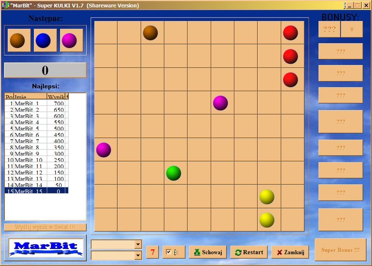 Dive into Super Balls, the addictive Color Lines-style puzzle where you match colorful marbles on a grid to clear lines and rack up bonuses. Strategize moves to avoid gridlock in this timeless Windows shareware gem from 2000.