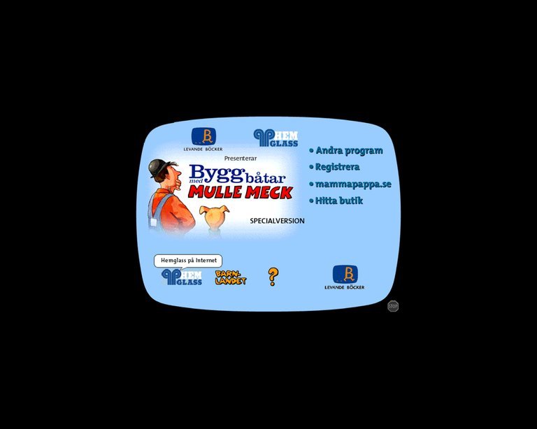 A 1999 special edition of ‘Bygg Båtar med Mulle Meck’ with Hemglass branding, featuring a full map upfront and an ice cream kiosk, but lacking some quests and inaccessible areas.